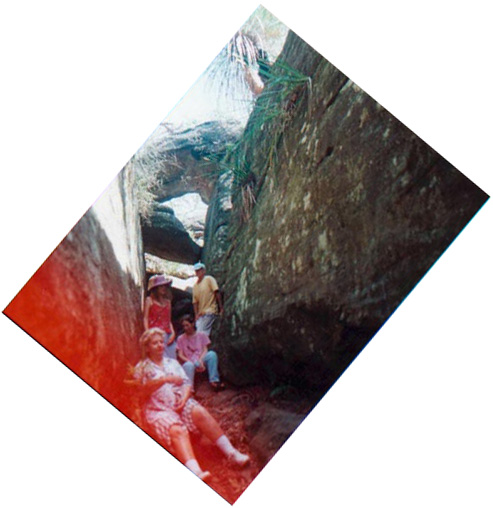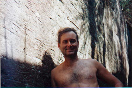 Directions: 1 hwy north from Sydney, exit 83 to Gosford. Turn right (near Kariong) at Woy Woy Rd. Then it's about 1.5 ks from this turn off. Just after you pass the suburbs/houses, you will hit bush, and a dirt turn off on the left. Park here on the side of the road. There is a metal gate. Start walking down this dirt road, maybe a kilometer (half mile). Turn left at the first left, keep going till there is another left. Just stay on the road, till you pass the Grand mother tree guardian on the left, (make sure to give her a big hug). And then walk towards Grandfather tree on the right. The one on the right is where the trail to the hieroglyphics are. You have to climb through the rocks to find them.